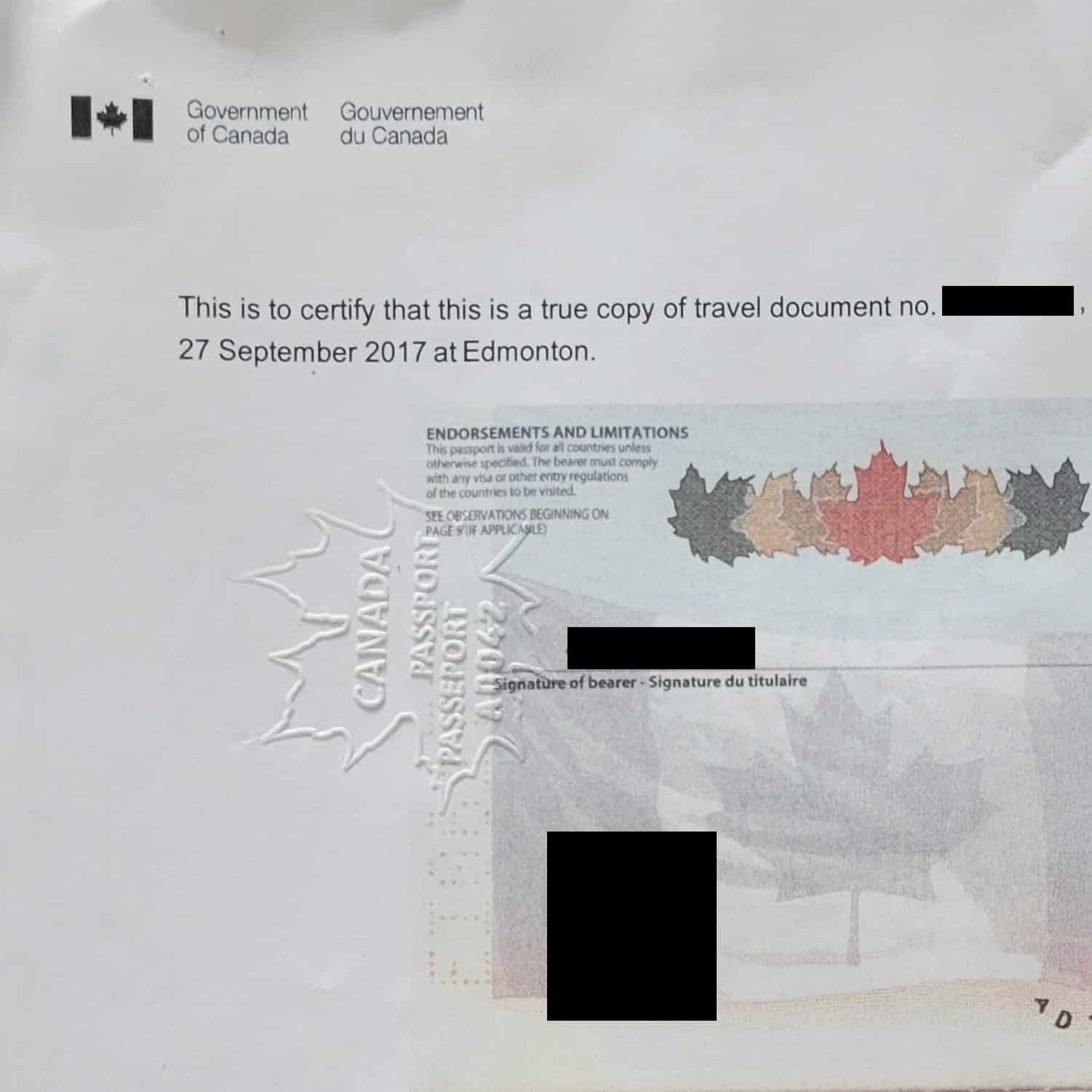 The above image is an example Certified True Copy of a Canadian Passport issued by the Government of Canada prior to September 2023. Note that the Government of Canada no longer imprints a raised dry seal on their passport certification, which means they are not accepted by the IRS as of September 2023.