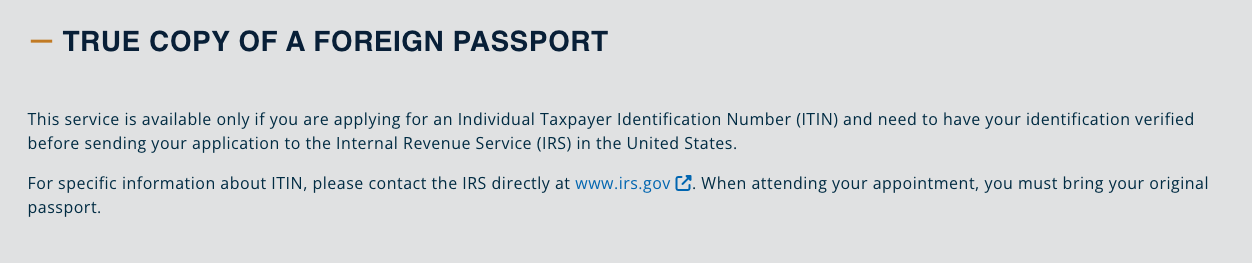 Make sure to bring the original foreign passport to your appointment, and be prepared to let them know that you require a Certified True Copy for a Form W-7 application for ITIN.