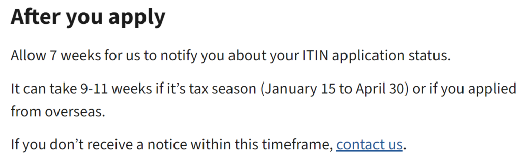 You can also call to inquire directly about your application’s status. However, the IRS encourages individuals awaiting their ITIN confirmation to wait for 7 weeks before making inquiries if they applied during the tax filing season, or 9 to 11 weeks if the application was sent with a tax return during peak times.